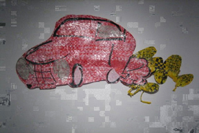 | Red Plaid SUV and Yellow Smoke 2010; 46" x 37", woven discarded plastic, marker | |||||||||||||||||||||