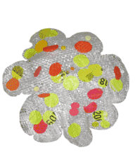 | Polka Dot Flower, 2010; 42" x 45", woven discarded plastic, wire, umbrella, plastic lids and bottle tops | |||||||||||||||||||||