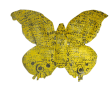 | Plaid Bird, (wings not shown) 2010; 16" x 29", woven discarded plastic, wire, plastic lids and staples | Plaid Butterfly, 2010; 54" x 40", woven discarded plastic | ||||||||||||||||||||