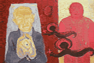 In the Racist series, the picture plane is divided in half, between the spiritual and the temporal, with angels of specific ethnic category bridging the gap. There is tension as they extend their offerings. Will they be rejected? Time is evoked has the moment passed? Has the subject responded? Ambiguity is in the representation of where the subject rests. Is that a coffin or a bed? If it's a coffin, is it too late? Or if the offer is being made after death, perhaps there's no such thing as too late. Perhaps the question is when it comes to God's mercy is there ever such a thing as being too late? The rosary beads in the racist's hand imply that he is already familiar with the traditions of religion, perhaps already 'saved.' The inference here is that salvation is multi layered, and piety not enough; the social dimension, cannot be neglected.